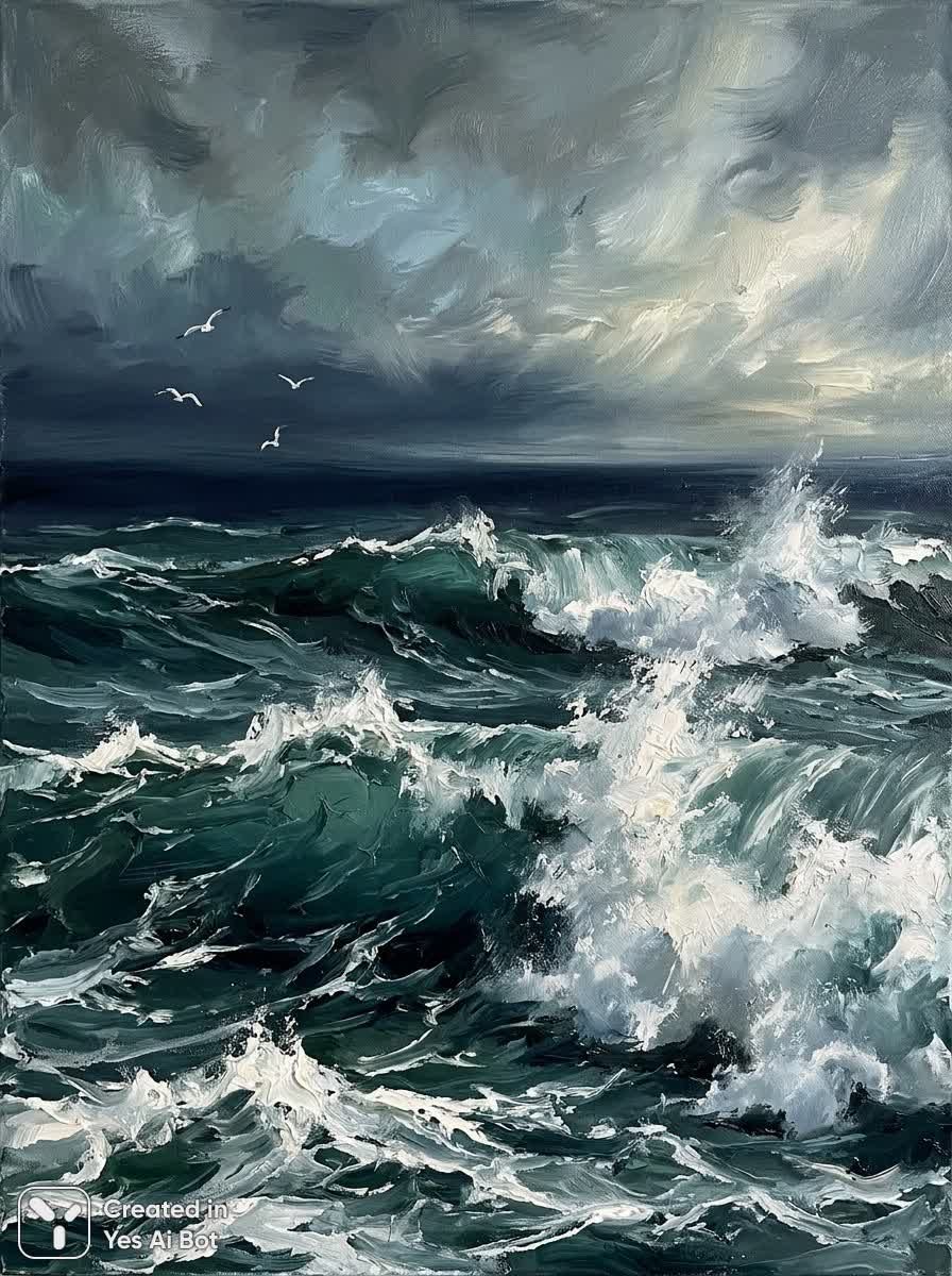 Мощное полотно запечатлело буйство океана в реалистичной импрессионистской манере. Густые текстурные мазки передают ярость тёмно-бирюзовой воды, где множество слоёв разбивающихся волн доминируют над композицией. Белые брызги и пена взрываются из гребней, подчеркивая бурное движение и неукротимую силу стихии. Чёткая тёмная полоса морской лазури обозначает горизонт, отделяя океан от мрачного неба. Небо представляет собой вихрь серо-голубых облаков с бледными полосами света, намекающими на надвигающуюся бурю или, возможно, просветление. Три маленьких белых чайки в полёте придают масштаб и ощущение воздушного движения на фоне бескрайнего неба. Рассеянное освещение, создающее глубокие тени и яркие блики на водной глади, добавляет драматизма. Картина пронизана ощущением необузданной природной энергии, немного грустной, но в то же время внушающей благоговение красоты. Перспектива расположена на уровне глаз зрителя с волнами, погружая его непосредственно в бурлящую сцену. Цветовая палитра богата оттенками глубоких зелёных, синих и серых цветов, а яркие белые акценты подчеркивают пену морских волн, создавая визуально захватывающее зрелище, полное мощи и величия природы. Это не просто изображение моря, это воплощение его необузданного характера и первобытной красоты