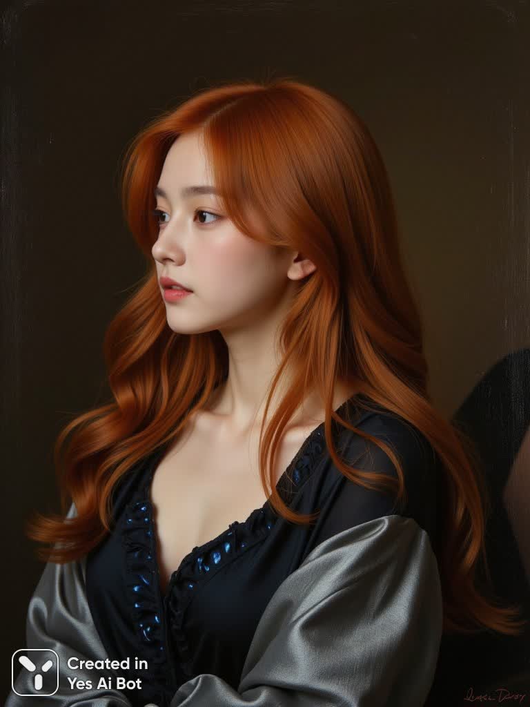 Портрет молодой европейской женщины с пышными волнистыми огненно-рыжими волосами, ниспадающими на лицо и плечи, завораживает своей красотой и загадочностью. В ее изящном профиле выделяются прямой нос, нежные слегка приоткрытые губы и светлая кожа с румяными щеками. Взгляд устремлен вдаль, влево, выражая задумчивость и спокойствие. На ней темное струящееся платье из мерцающей ткани, написанное в манерной живописной технике с видимыми мазками кисти в серебристых синих и серых тонах, элегантно драпирующее декольте. Фон выполнен в глубоких темно-коричневых почти черных оттенках, создающих ощущение глубины благодаря едва заметным текстурным переменам. Мягкое рассеянное освещение ласково подсвечивает лицо и подчеркивает насыщенные тона волос. Камера сосредотачивается на крупном плане головы и верхней части туловища, представленном с небольшим голландским углом обзора. Атмосфера пронизана романтикой и интроспекцией, вызывая чувство тихой красоты и классической портретной живописи, напоминающей творчество художников Прерафаэлитов. Свободная но точная работа кисти создает эффект мягкого фокуса, добавляя изображению нежности и утонченности, демонстрируя мастерство исполнителя и создавая ощущение вневременной элегантности и внутренней гармонии