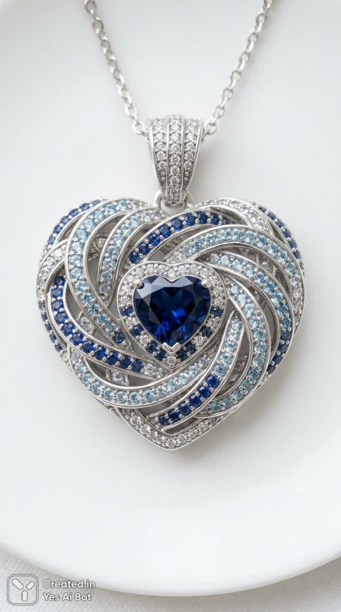 elegant silver interwoven heart-shaped pendant, encrusted with dark blue, light blue and clear crystals, center dark blue heart-shaped gemstone, bail decorated with clear stones, flat lay macro, soft diffused lighting, BG white, hd jewelry photo, emphasis on sparkle and texture.