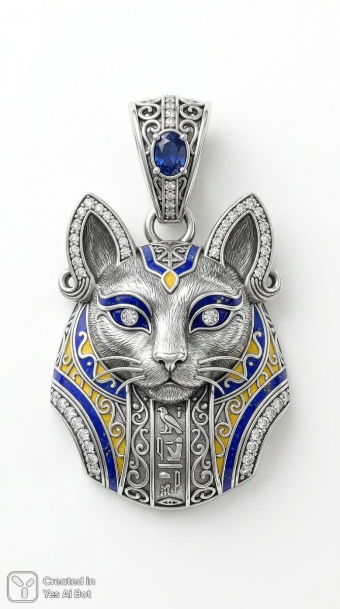 Серебряный кошачий медальон в египетском стиле с яркими акцентами эмали - Пример работы ИИ Nano-Banana