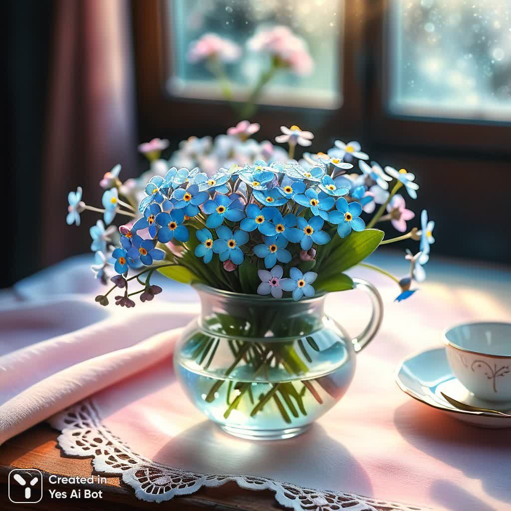 Нежные акварельные незабудки: солнечный натюрморт в хрустальной прозрачности - Картинка, созданная нейросетью Stable Diffusion