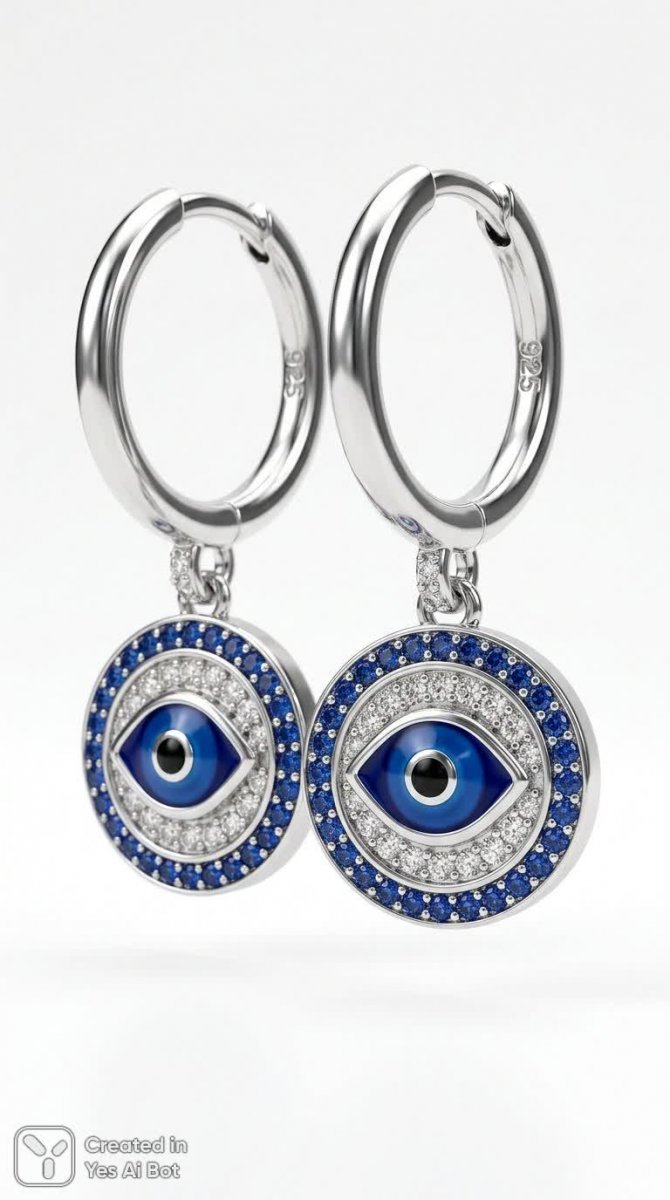 sterling silver 925 hoop earrings with round evil eye pendant, border of clear and blue crystals, metallic silver details, smooth polished surface, front view, macro shot, soft lighting, white BG, luxury product photo, high clarity.