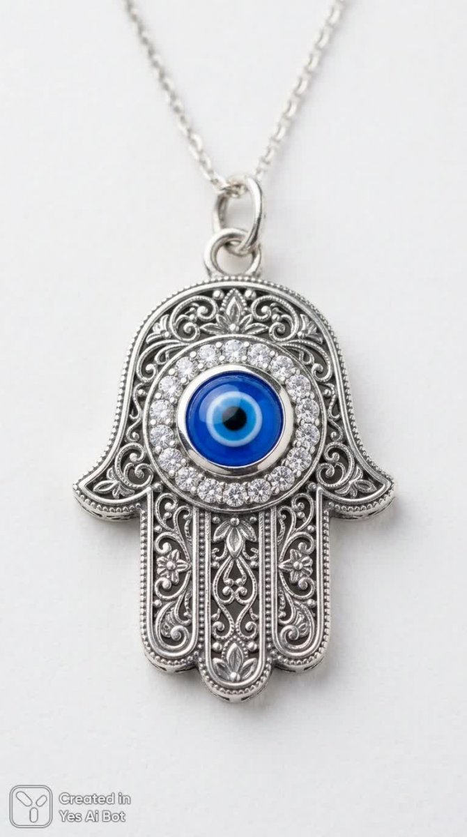 silver hamsa hand pendant, intricately designed, center featuring blue evil eye surrounded by clear gemstones, delicate filigree carvings, soft lighting, minimalistic white BG, macro shot, focus on details, jewelry photography style, high clarity.