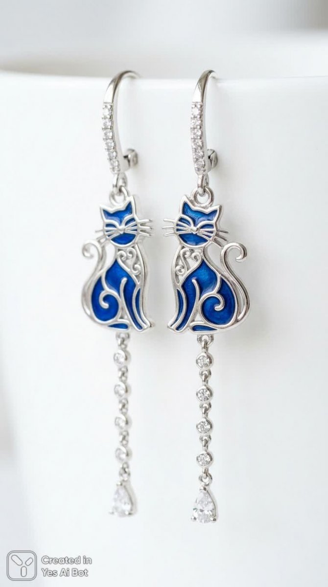 silver dangle earrings, intricate cat silhouette with blue enamel accents, chains adorned with tiny clear gemstones, bright lighting, minimalistic white BG, close-up macro shot, jewelry photography style, focus on craftsmanship and design details.