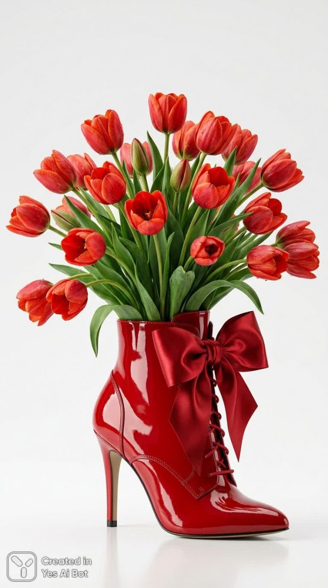 nanobanana Яркий букет красных тюльпанов в стильной обуви. Генерация из нейронной сети Nano-Banana