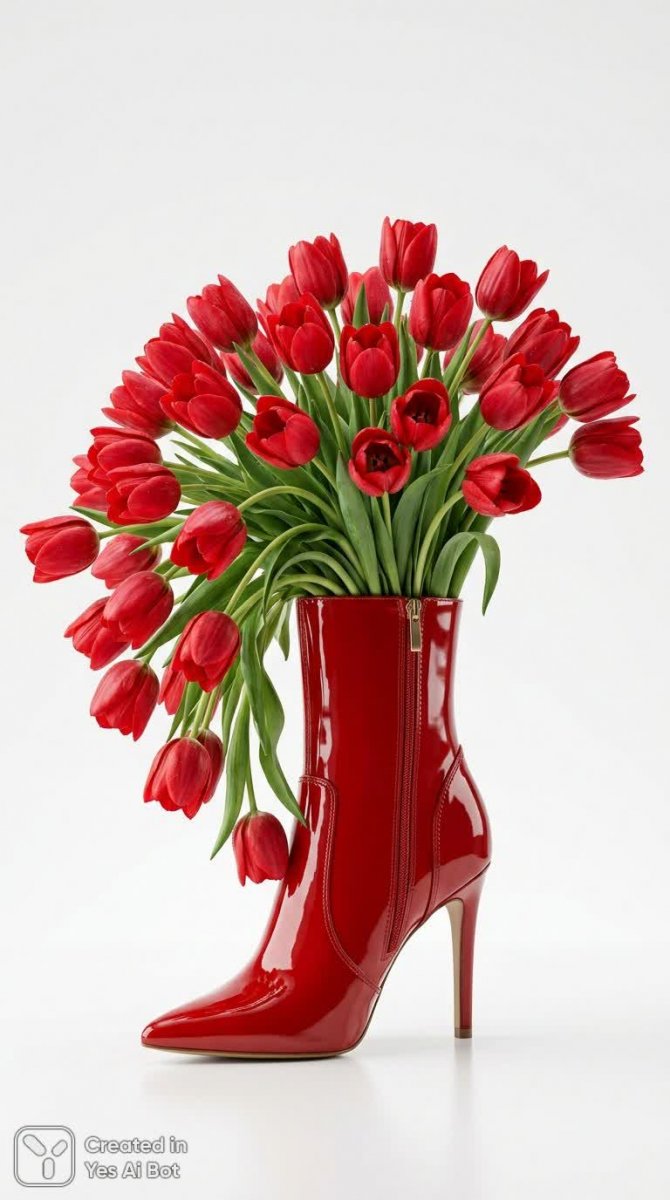 nanobanana Яркий букет красных тюльпанов из элегантного ботинка. Генерация из нейросети Нано Банана