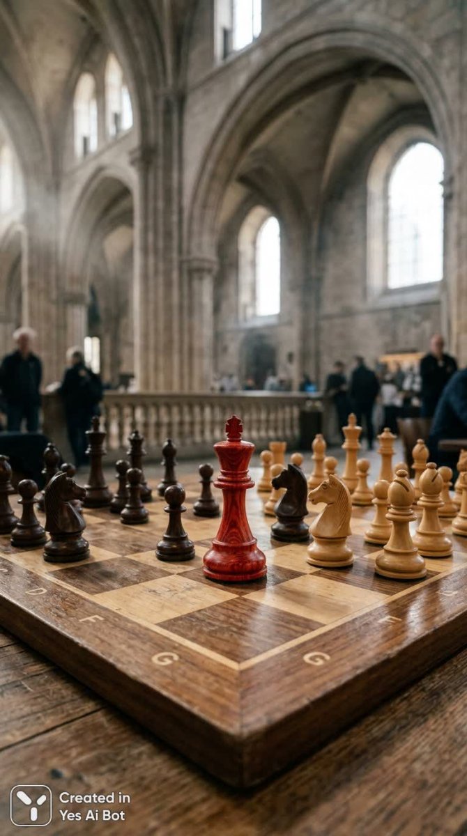 large chessboard in blurred indoor space with high ceiling and arches, single red chess piece centered, surrounding pieces black and white, overall mood of concentration and quiet energy