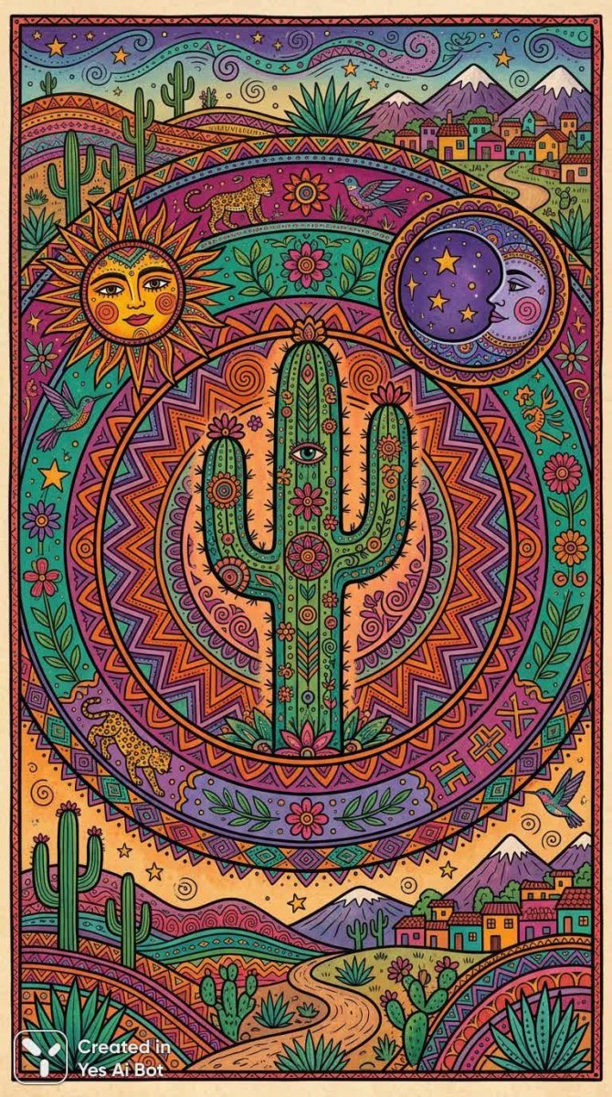 nanobanana Яркая кактация мандала в стиле мексиканского фольклора. Изображение из нейросети NanoBanana