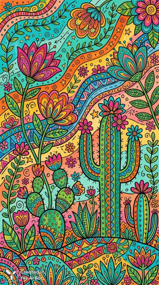 Яркое искусство с кактусами и цветочными мотивами в мексиканском стиле - Изображение, созданное нейросетью Nano Banana