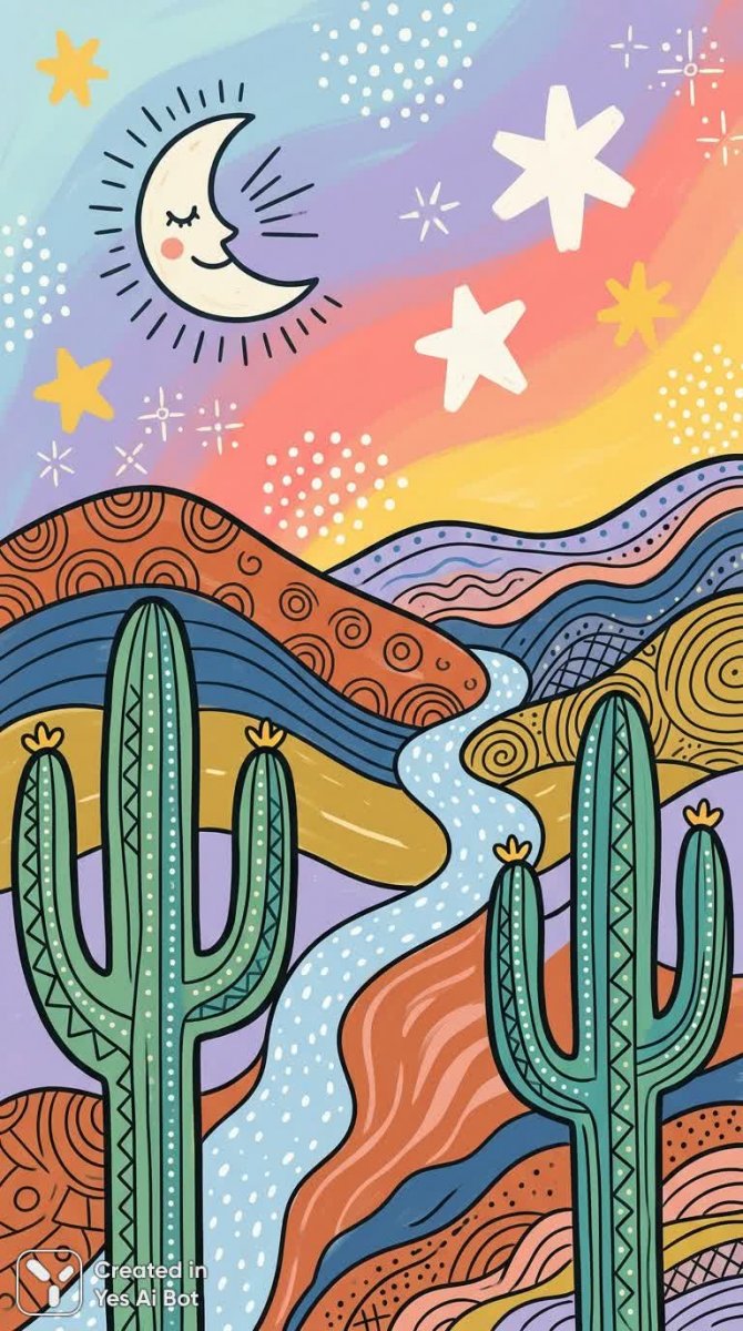 two large cacti in the foreground, stylized waves of color and abstract hills, multicolored sky with moon and stars, bold outlines, geometric patterns and dots, naive art, highly saturated neon palette, sense of joy