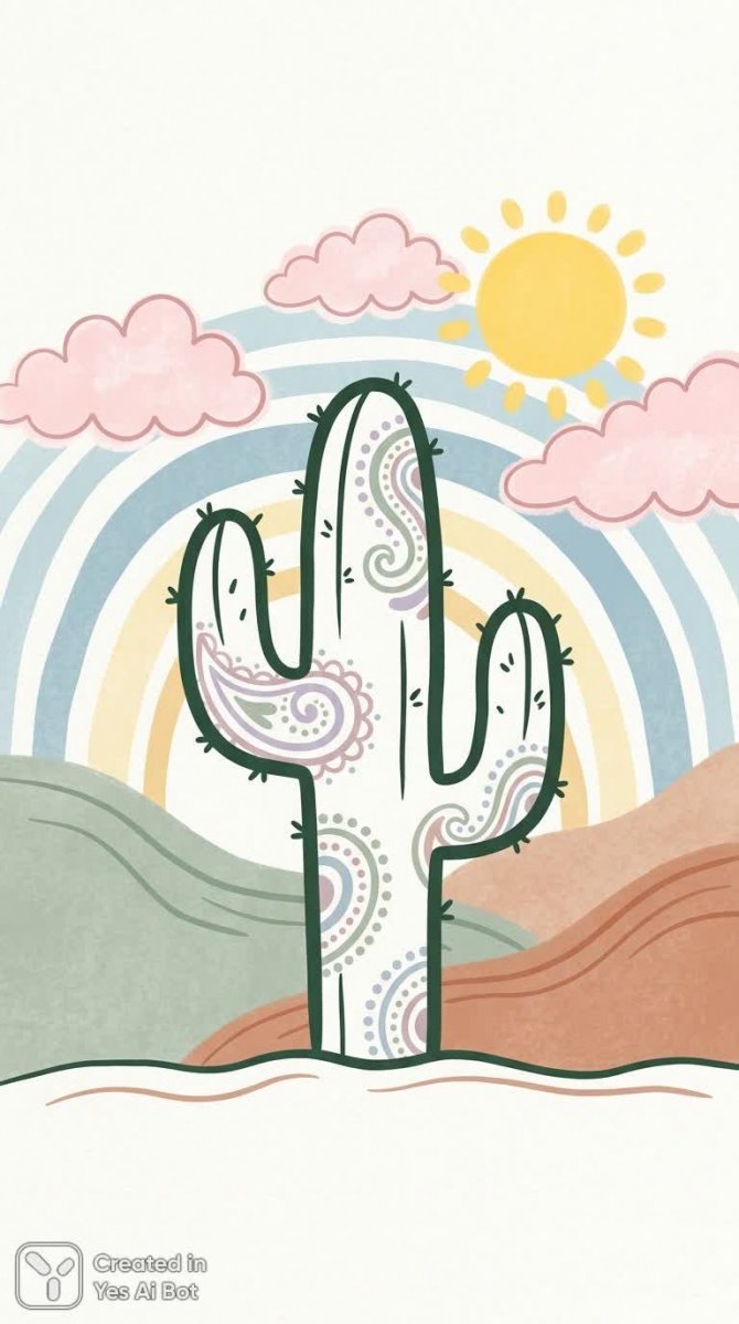 Яркий и жизнерадостный рисунок демонстрирует кактус, занимающий центральное место в композиции. Кажется, будто он оживает на фоне психоделических орнаментов, создающих атмосферу волшебства и фантазии. Четкие контуры подчеркивают силуэт кактуса и других элементов, добавляя картине выразительности. Многослойный фон, украшенный причудливыми узорами, создает эффект глубины и динамичности. Яркое желтое солнце и нежные розовые облака наполняют картину теплом и светом, создавая ощущение радостного летнего дня. Стиль исполнения напоминает декоративную живопись, выполненную в манере детского рисунка – наивной, непосредственной и искренней. Картина излучает позитив, креативность и вдохновение, приглашая зрителя окунуться в мир ярких красок и воображения. Это произведение искусства способно поднять настроение и подарить улыбку каждому, кто на него взглянет. Акцент на деталях и необычное сочетание цветов делают этот рисунок запоминающимся и уникальным. Он словно приглашает нас заглянуть в мир детских грез и фантазий, где нет места скуке и однообразию