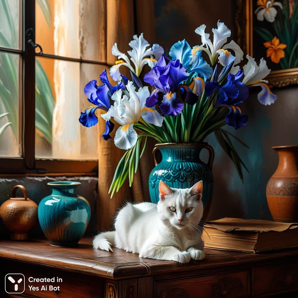 Уютное домашнее тепло разливается от этого полотна. Нежная палитра ирисов в хрустальной вазе на столе создает атмосферу спокойствия и гармонии. Мягкий свет подчеркивает красоту цветов, а белорыжий кот, свернувшийся клубочком у подножия вазы, добавляет сцене очарования и безмятежности. Художник мастерски использует технику импасто, нанося крупные фактурные жирные мазки, которые придают изображению объем и выразительность. Кажется, что можно почувствовать шелковистость лепестков и тепло кошачьей шерсти. Это произведение искусства – воплощение красоты в простоте, нежность в деталях и гармонию в каждом штрихе. Наблюдение за этой сценой дарит ощущение умиротворения и душевного комфорта, словно перенося зрителя в мир спокойствия и домашнего очага. Картина излучает светлое настроение и радует глаз богатой текстурой и сочными цветами. Это настоящий гимн красоте обыденных моментов и маленьким радостям жизни