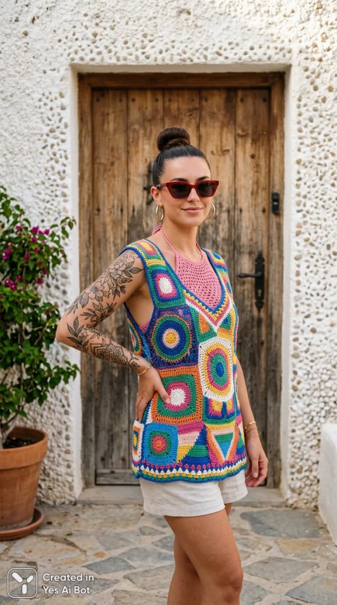На фотографии изображена эффектная женщина, позирующая перед стеной из белой каменной крошки и деревянной дверью. Её образ сочетает в себе дерзость и беззаботность летнего отдыха. На ней надето яркое розовое цельное купальное платье с ажурной вязкой крючком и оригинальным декольте в виде сетки, удерживаемое тонкими бретельками. Левая рука украшена татуировкой, добавляющей индивидуальности её внешности. Волосы собраны в высокий пучок, акцентируя внимание на изящной шее, на которой красуются большие серьги-кольца. Красные солнцезащитные очки придают образу завершенность и загадочность. Верхний слой одежды – красочный вязаный чехол крючком, состоящий из слоев различных геометрических фигур: кругов, квадратов и треугольников в насыщенных оттенках синего, зеленого, желтого и розового цветов. Чехол создает впечатление легкости и летней беззаботности. Женщина слегка повернулась в сторону, одна рука придерживает бедро, что добавляет динамики и уверенности её позе. Вся композиция излучает позитив и энергию, создавая атмосферу солнечного дня на берегу моря или у бассейна. Это идеальный пример стильного летнего образа, сочетающего в себе оригинальность, яркость и комфорт. Фотография запечатлела момент беззаботности и уверенности в себе, демонстрируя красоту и индивидуальность современной женщины