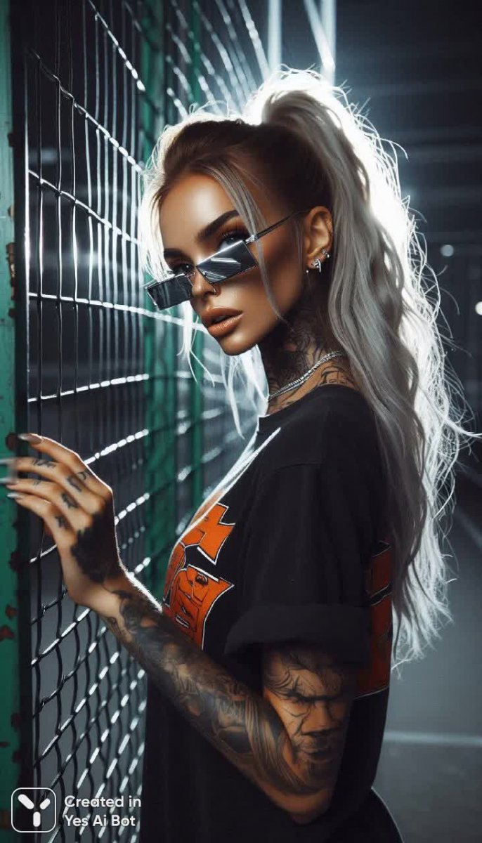 Загадочный снимок, словно выхваченный из прошлого благодаря пленочной текстуре и характерным дефектам – царапинам и легкой нерезкости. Ночная сцена окутана серым туманом, а вспышка камеры оставляет на изображении призрачное опаловое сияние. В центре внимания – эффектная девушка с безупречной фигурой, чье тело украшают татуировки на шее. Ее длинные светлые волосы собраны в высокий хвост, дополненный элементами дредов, придающими образу дерзости и индивидуальности. Она уверенно стоит у зеленого металлического забора, одной рукой придерживая стильные серебристые солнцезащитные очки узкой прямоугольной формы. Повернувшись вполоборота, она бросает взгляд прямо в камеру – взгляд одновременно загадочный и притягивающий. Черная футболка с яркими оранжевыми надписями в стиле комиксов и сетчатые перчатки добавляют образу динамики и современности. Сложная композиция усиливается благодаря технике двойной экспозиции: прутья забора, словно тень, переплетаются с ее лицом и телом, создавая завораживающий узор из света и тени. На заднем плане едва различима спортивная площадка, утопающая в сумеречном свете, что лишь подчеркивает концентрацию внимания на главной героине этого сюрреалистичного изображения, наполненного таинственностью и энергией. Это не просто портрет, а целая история, рассказанная языком пленки и света