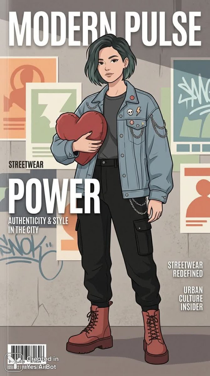 Молодая женщина в смелой и дерзкой позе приседания, демонстрирует уверенность и силу. Акцент на ее образе привлекает внимание массивные красные ботинки, подчеркивающие бунтарский дух и готовность к действию. Черные карго-брюки добавляют практичности и функциональности образу, а джинсовая куртка, украшенная цепями, завершает ансамбль в стиле гранж. В руках она держит огромный плюшевый красный сердечный символ, создающий интересный контраст между жесткостью внешнего вида и нежной чувственностью. Фоном служит динамичная городская среда – граффити и разорванные постеры создают атмосферу уличного искусства и протеста. На переднем плане выделяется смелый типографический элемент с надписью 'POWER', подчеркивающий тему силы, решимости и независимости. Добавление глянцевой обложки журнала намекает на связь с миром моды и медиа, добавляя слои смысла к визуальному повествованию. Вся композиция пронизана атмосферой панк-урбанизма – сочетанием бунтарского духа, уличной эстетики и ярких акцентов. Драматическое студийное освещение усиливает эффектности кадра, создавая игру света и тени, которая подчеркивает текстуры и формы, добавляя глубины и выразительности образу модели. Это визуальная история о сильной женщине, не боящейся проявлять свою индивидуальность и бросать вызов общепринятым нормам, сочетающая в себе элементы моды, искусства и уличной культуры