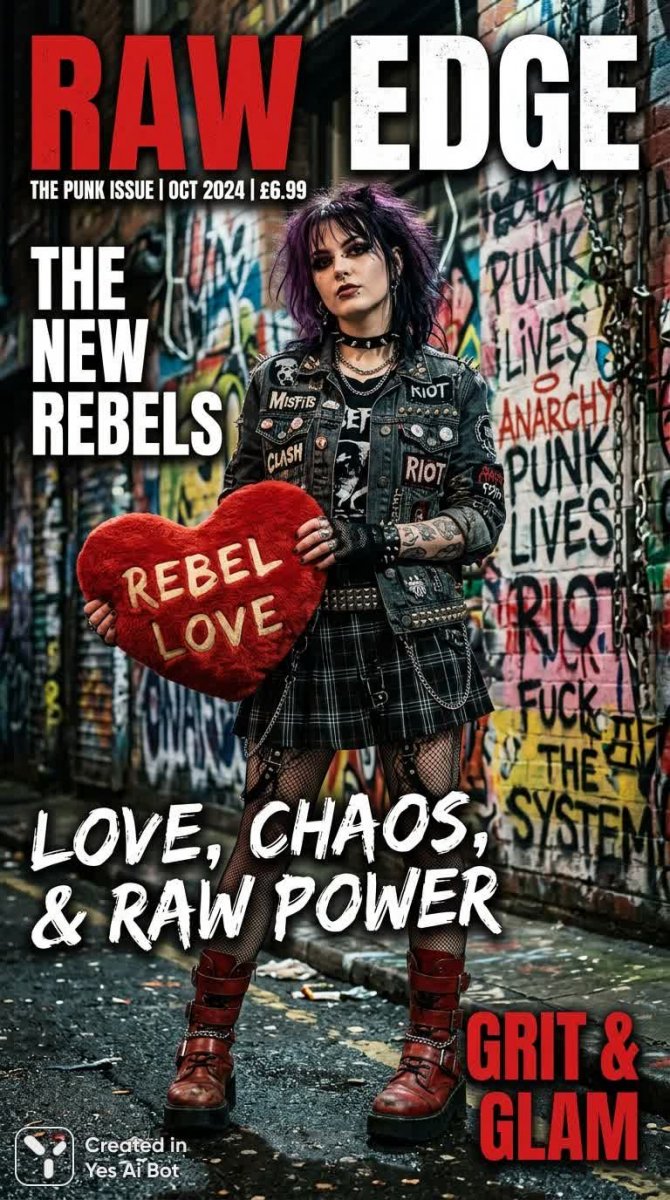 Стильный образ на обложке глянцевого журнала воплощает дерзкий дух панк-культуры. В центре внимания – молодая девушка в джинсовой куртке, которая становится ярким акцентом на фоне граффити и цепей. Ее вид подчеркивает бунтарский характер и индивидуальность. Короткая черная юбка придает образу легкости и игривости, а массивные красные ботинки добавляют смелости и уверенности в каждом шаге. Яркий красный плюшевый сердец в руках создает неожиданный контраст с общей атмосферой протеста, символизируя нежность и уязвимость под маской дерзости. На фоне ярких граффити и массивных цепей выделяется смелая типографика с провокационным слоганом. Все элементы композиции гармонично сочетаются, создавая мощный визуальный образ, который притягивает взгляд и заставляет задуматься о противоречиях современной молодежной культуры. Этот образ – это заявление о свободе самовыражения, смелости быть собой и отрицании общепринятых норм. Это идеальное отражение духа времени, сочетающее в себе элементы моды, искусства и протеста. Глянцевая обложка подчеркивает современность и актуальность этого яркого и запоминающегося образа, который не оставит равнодушным ни одного поклонника смелого стиля