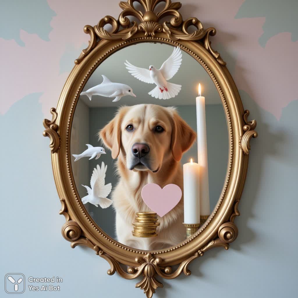 В этом завораживающем зеркале овальной формы, выполненном из позолоченного металла, отражается сюрреалистичная картина, сотканная из потусторонних символов и неземной красоты. В самом центре зеркального полотна располагается полупрозрачный образ золотистого ретривера с выразительными глазами, полными нежности и доброты, словно он смотрит вглубь души зрителя. Слева от собаки изящно парит стилизованный дельфин, чья форма переливается и кажется невесомой. Над собакой, в полете, застыла белая голубка с распахнутыми крыльями – символ мира и спокойствия. Справа от голубки на колонне горит высокий белый светильник с мягким пламенем, наполняющим пространство теплым, приглушенным светом. Между светильником и собакой деликатно расположилось сердце в форме сердца нежного пастельного оттенка, намекая на любовь или нежную привязанность. Под дельфином и слева от собаки мерцает стопка золотых монет, символизирующих достаток и процветание. Само зеркало украшено сложной резьбой, выполненной в виде витиеватых завитков и цветочных мотивов на позолоченной раме, что придает ему неповторимый шарм старины и элегантности. Фон за зеркалом выдержан в нежных пастельных тонах голубого и розового, создавая ощущение волшебной сказки и мечтательности. Общая атмосфера картины пронизана покоем, надеждой и легкой меланхолией, вызывая ассоциации с воспоминаниями или сокровенными желаниями. Зеркало выступает в роли центрального элемента, а отражения в нем формируют многослойный визуальный рассказ, погружая зрителя в мир символов и духовности. Мягкое рассеянное освещение придает сцене мечтательный вид, напоминающий о произведении искусства, наполненном глубоким смыслом и загадочностью