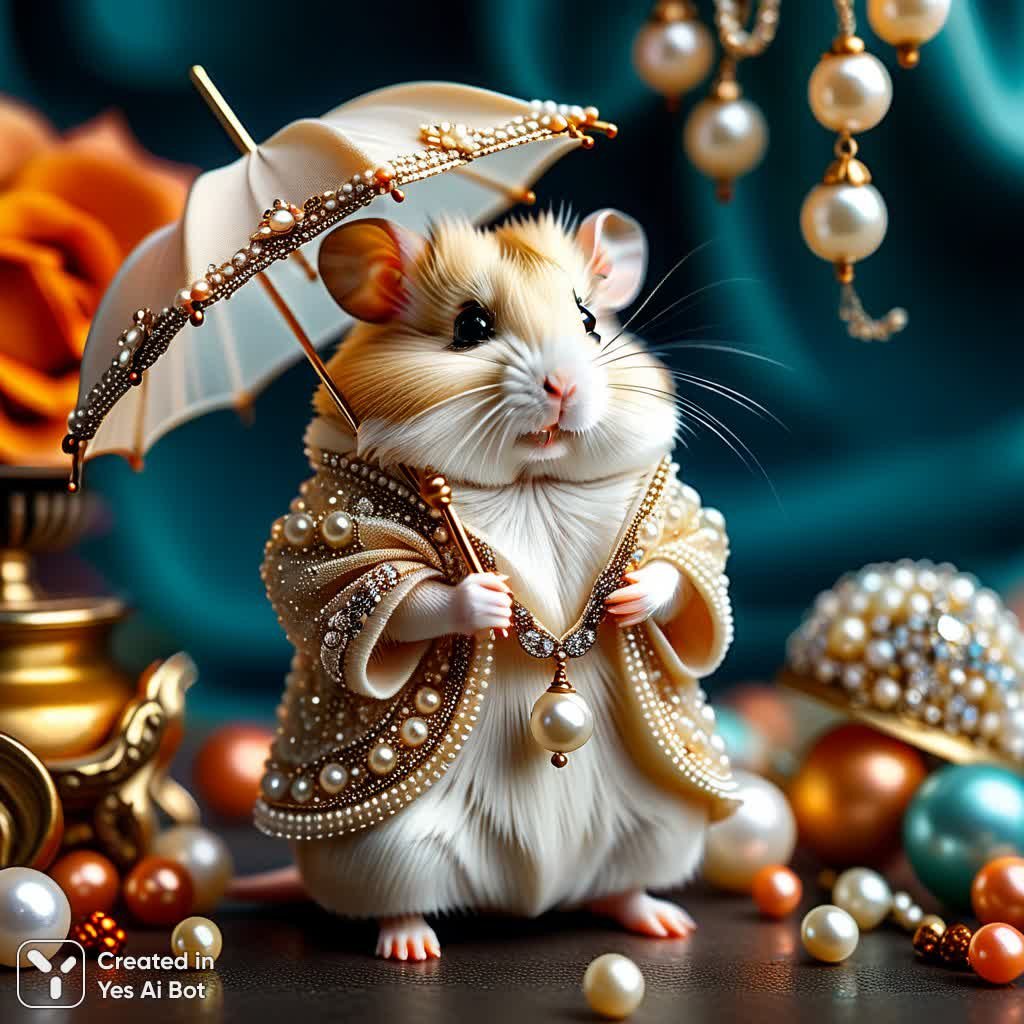 Adorable hamster dressed in a lavish, pearl-encrusted gown and hat. Creamy-beige fur on a small hamster. A full-length, lavish pearl-studded gown covers the hamster, meticulously crafted from large and small pearls. Matching pearl-studded hat is perched atop the hamster's head. The hamster is posed on a swing, feet in delicate pearl-embellished heels. The pose is playful and elegant. A miniature pearl umbrella completes the ensemble.
