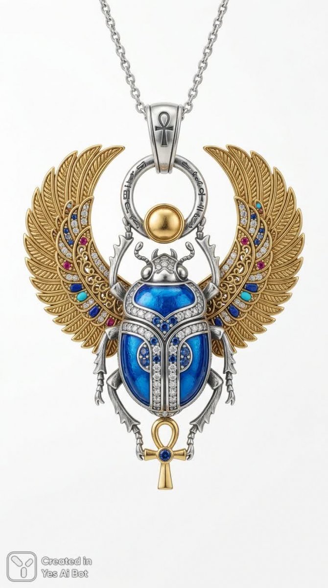 scarab pendant egyptian style, silver metal with golden wings, blue enameled shell inlaid with clear and blue gemstones, ankh symbol on ring, studio photography, clean white BG, hd, front angle, jewelry centered, soft lighting, detailed enamel and metal texture