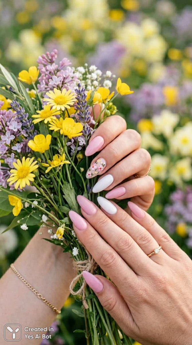 long almond-shaped nails, pastel shades of pink, white and natural, one nail with delicate striped floral design, female hands holding bouquet of yellow and lilac flowers, soft natural lighting, macro, BG blurred flower bouquet, fresh summer style, low shooting angle, bokeh, fashion beauty photo, soft diffused lighting image, soft-focused editorial shot of manicured hands cradling blooms, elegant pastel almond nails with a subtle striped accent.