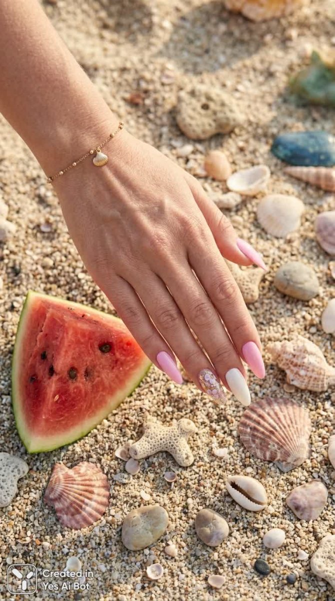top-down macro of an elegant hand with long almond nails in pastel pinks and white, accent striped nail, placed among seashells and a watermelon slice, soft sunlit summer scene, dreamy bokeh