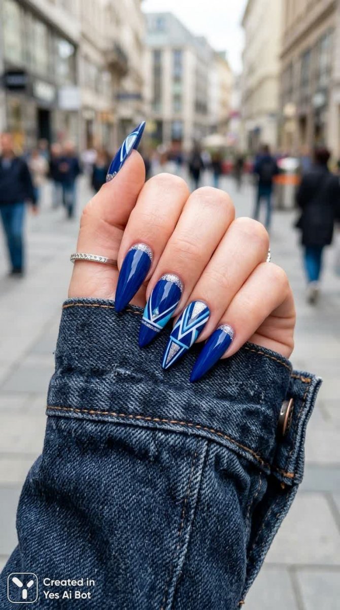 female hand, long stiletto nails, glossy deep blue polish, silver glitter accents at nail bases, geometric white-blue patterns with silver highlights, neat manicure, hand in denim jacket, BG blurred street cityscape, macro shot, hq, natural light, fashion photo style