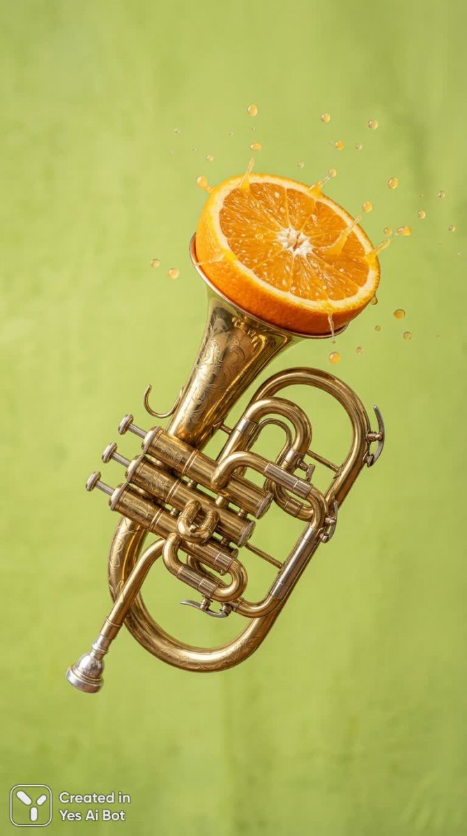 a surreal brass trumpet with a halved orange replacing the bell, juice droplets suspended midair, vibrant lime green backdrop, high clarity, playful food art photography, clean lines, soft lighting