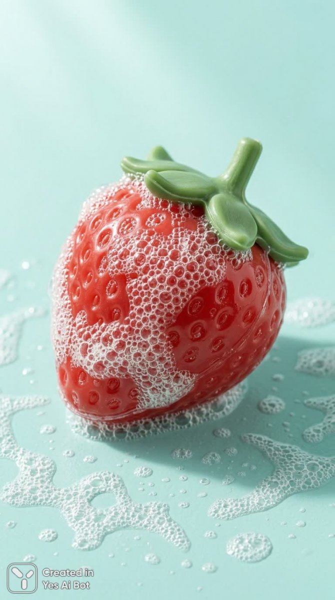 Невероятно реалистичная сцена, где обыденный предмет – кусок мыла в форме сочной клубники – превращается в произведение искусства. Глянцевая поверхность ягоды безупречно передает текстуру и цвет спелого фрукта, создавая иллюзию натуральности. Вокруг мыла-клубники образуются нежные жемчужины пены, словно сотканные из света и воздуха, добавляя изображению легкости и воздушности. Мягкий пастельный фон цвета морской волны идеально подчеркивает яркость клубники, не отвлекая внимание от главного объекта. Яркое студийное освещение выявляет каждую деталь, а четкие тени придают изображению глубину и объем. Минималистичная композиция позволяет зрителю сосредоточиться на красоте и необычности сочетания формы и текстуры. Острота фокуса обеспечивает максимальную детализацию, позволяя рассмотреть мельчайшие нюансы поверхности клубники и пены, создавая ощущение полного погружения в этот удивительный мир визуальных образов. Эта работа – пример мастерского владения техникой гиперреализма, демонстрирующий способность художника создавать иллюзию реальности с помощью художественных средств. Кажется, будто можно почувствовать аромат спелой клубники и прикоснуться к нежной пене. Это не просто изображение мыла, это ода красоте в самых обыденных вещах, выполненная с невероятной точностью и вниманием к деталям. Идеально для любителей минимализма и ярких акцентов