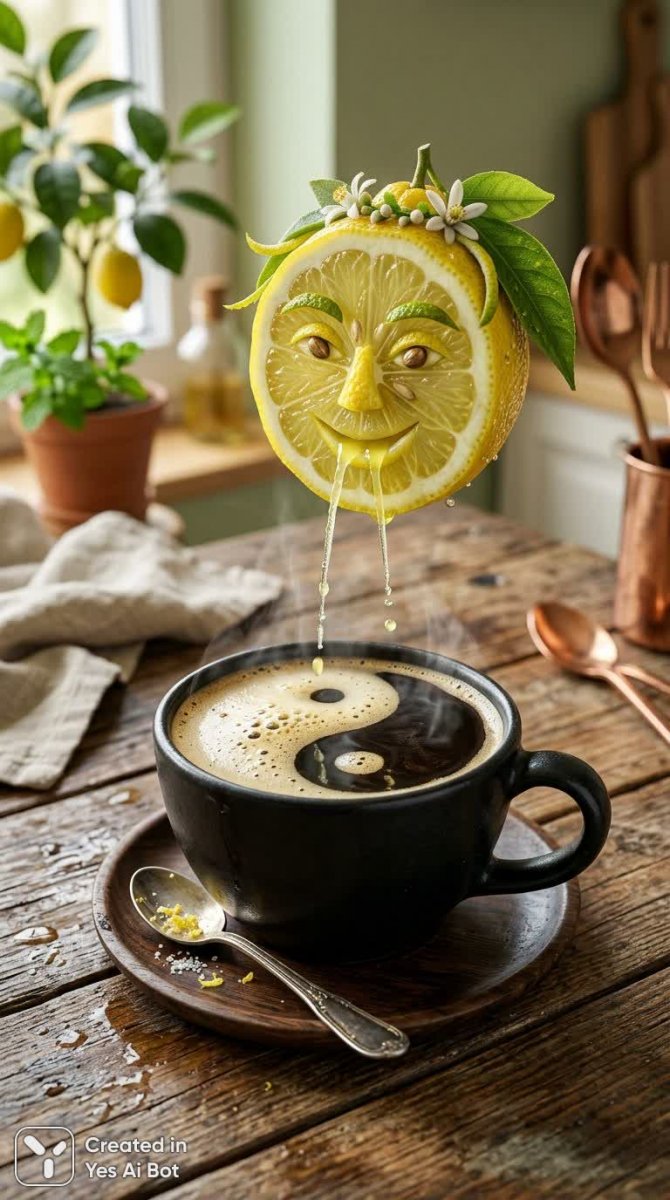 Лимонный душ над чашкой кофе: гиперреалистичная композиция - Картинка, сгенерированная нейросетью NanoBanana
