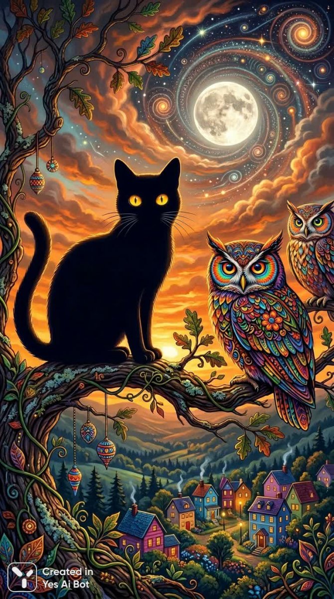 Иллюстрация, сгенерированная нейросетью Nano Banana, представляет собой сказочный мир, где обитают ночные существа и расположено волшебное поселение. В центре композиции – черный кот с большими желтыми глазами на ветке дерева, символизирующий хранителя этого места. Вокруг него располагаются яркие совы с психоделическими узорами на оперении, каждый рисунок которых уникален и динамичен. На заднем плане – закат с насыщенными красками и огромной белой луной, окруженной спиралями, создающими ощущение приглашения к путешествию в мир фантазий. У подножия холма расположена деревня с разноцветными домами, излучающими тепло и уют. На животных нанесены детализированные рисунки в стиле doodle, добавляющие изображению игривости. Общий стиль – выразительный, причудливый, с насыщенными цветами и фантастическими элементами, что делает работу произведением искусства, полным волшебства и таинственности, выполненным в стилях реализма и детализации. Изображение создано с использованием Telegram Bot - Yes Ai.
