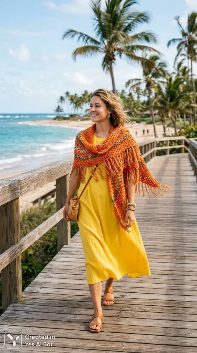 woman in a chic yellow bikini, wearing a vibrant orange crochet shawl draped stylishly around her shoulders, walking along a sunlit boardwalk, soft breeze tousling her hair, palm trees and ocean in the distance, fueling a vibrant summer aesthetic, minimalistic and fresh look.