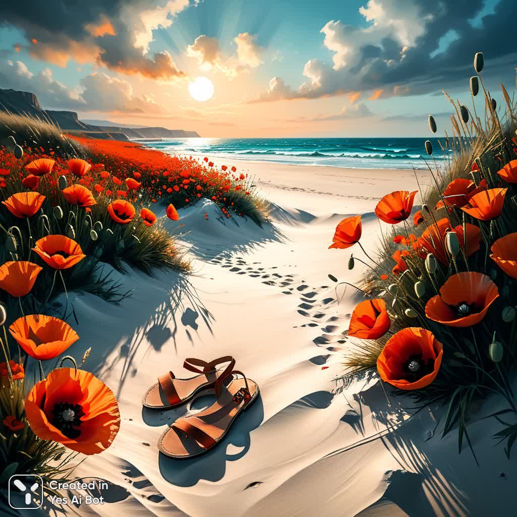 canvas, oil, palette knife, poppies and grass on the beach, white sand, clouds, waves forgotten bright sandals