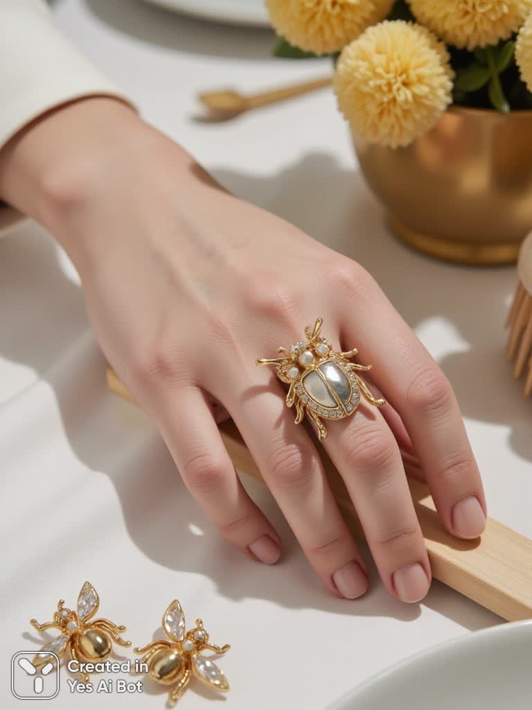 The detailed close-up image shows a human hand decorated with an ornate beetle-shaped ring. The ring, made of gold-colored metal, is decorated with intricate details on the body and legs of the beetle, as well as a variety of small transparent crystals that mimic the facets of the insect. A hand with fair skin and neatly manicured flesh-colored nails is positioned above a white tablecloth, fingers slightly bent. To the left of the brush on the fabric are two small brooches in the shape of bees with pearl inserts. In the background, a golden vase with fluffy yellow pompoms and a white plate can be seen, indicating a formal dinner setting. The ...