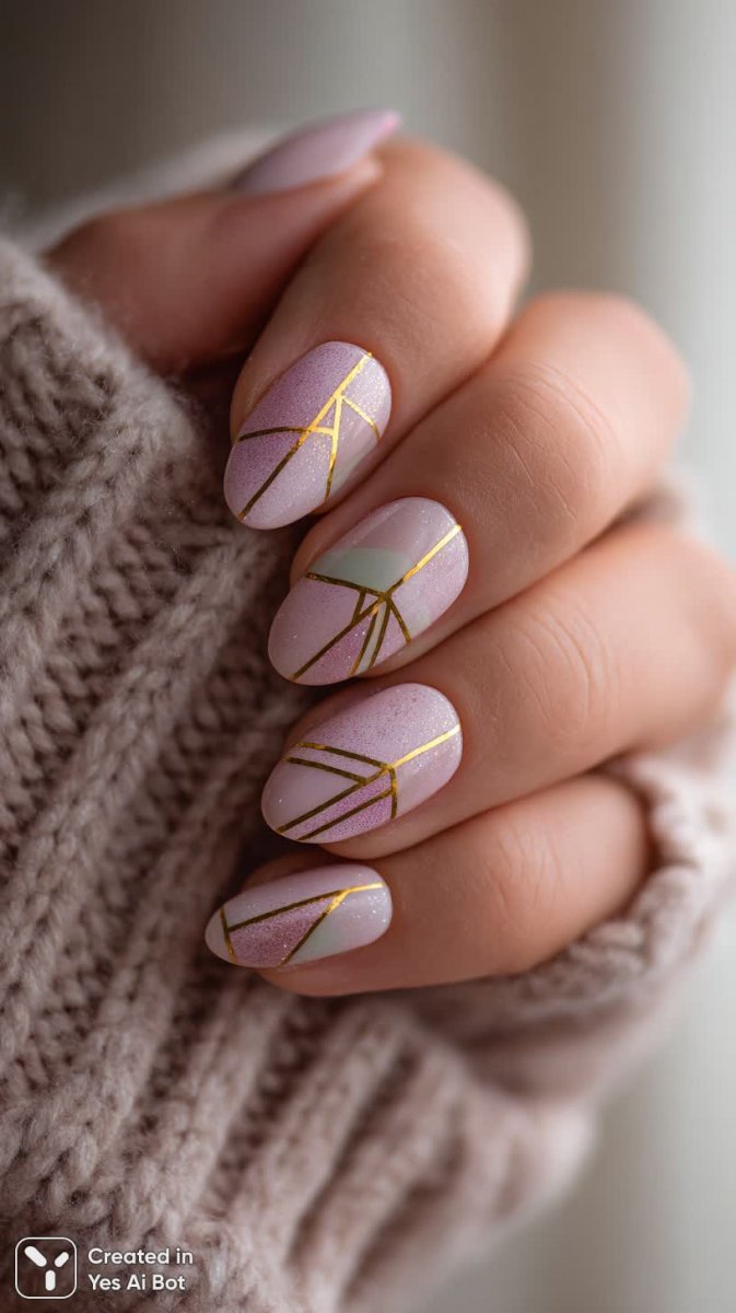 long almond-shaped nails, clean and neat design, pastel shades of green and lilac, accented with subtle gold lines, hand in cozy knitted sweater, soft natural lighting, macro detail, gentle bokeh effect, stylish beauty look.