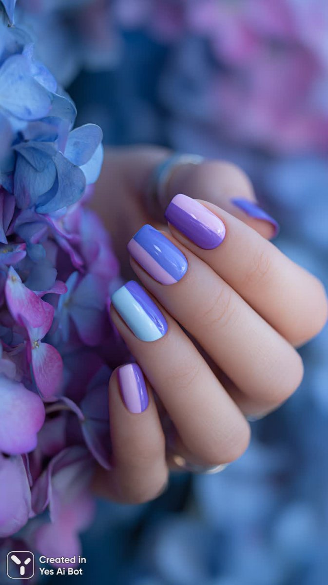 bright neon manicure on long square nails, combined designs of purple, blue, and white, abstract shapes, glossy sheen, hand wearing delicate rings, blurred floral background, macro shot, vivid color contrast, soft diffused lighting.