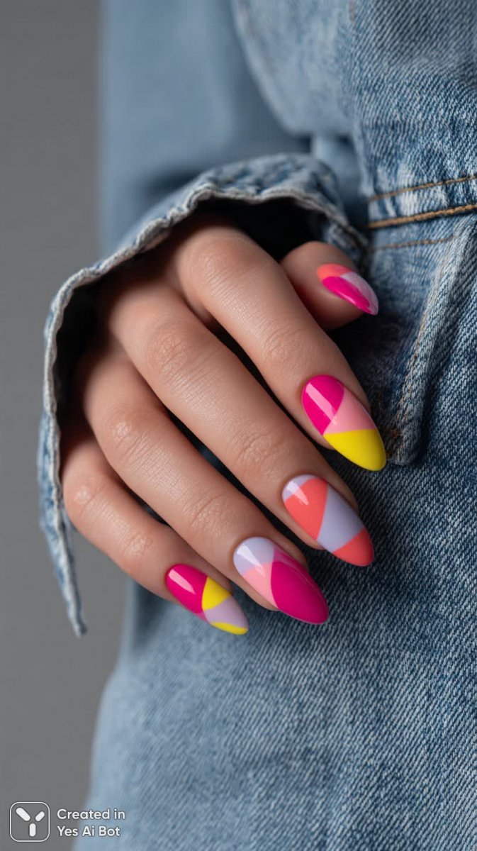 long pointed nails, glossy finish, bright pink and neon yellow, geometric patterns with abstract swirls, hand in denim jacket, soft natural light, macro photography, blurred white background, modern nail art aesthetic.