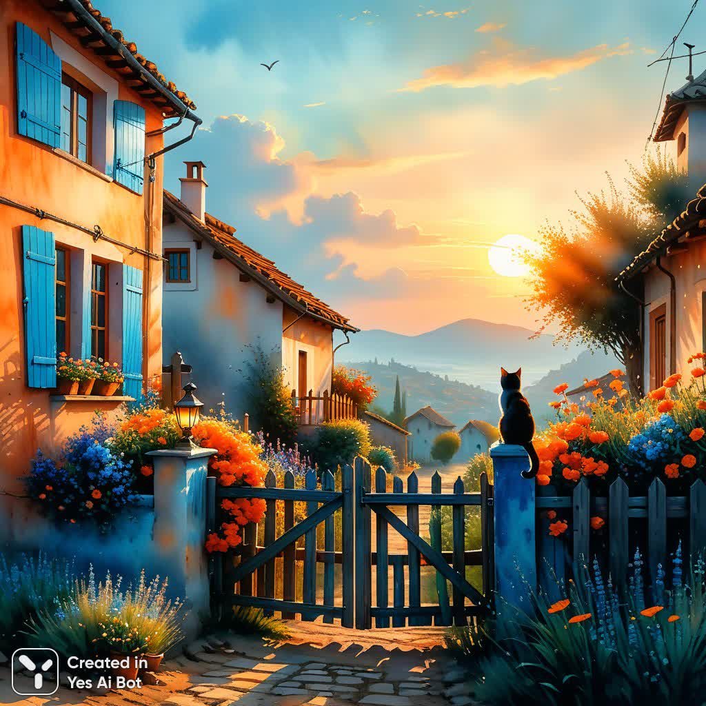 A quaint village scene with a wooden fence, a cat perched on a post, and a house with a blue door. The fence is adorned with flowers and the sky is a soft blend of orange and blue hues, suggesting either sunrise or sunset., (watercolor), high resolution, intricate details, 4k, wallpaper, concept art, watercolor on textured paper. Overall, it's an absolute world-class masterpiece watercolor artwork. It's an aesthetically pleasing watercolor artwork with impeccable attention to detail and impressive composition.