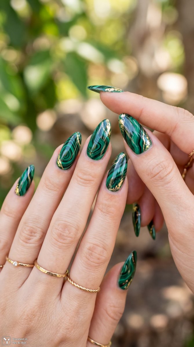 long nails, malachite-inspired design, deep green and black swirls, glossy finish, shiny gold accents, female hands with delicate rings, macro shot, soft diffused lighting, blurred natural background, high detail, elegant nail art style.
