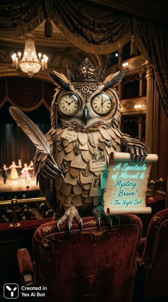 Крупный план театральной ложи. На спинке бархатного кресла сидит огромная сова в монокле. Ее перья выглядят как страницы старинных винтажных книг, а глаза — это два циферблата часов, показывающих разное время. Она держит одним крылом гусиное перо, другим крылом свиток с рецензией, написанной светящимися чернилами. Ее когти крепко сжимают спинку бархатного кресла, на которой она сидит. На ее голове крошечная металлическая корона из театральных масок (Трагедии и Комедии). Атмосфера таинственная, полумрак зрительного зала. Стимпанк, викторианский сюрреализм, Детализированность, реалистичность.