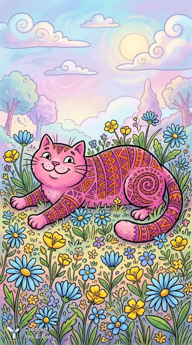 smiling pink cat with intricate orange and purple geometric patterns, stretched out among cheerful blue and yellow flowers, whimsical composition, thick black outlines, playful lighting, softly blended pastel background showing a whimsical sky, cartoon art style.
