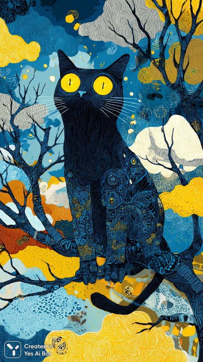 Загадочный черный кот, словно сошедший с полотен сюрреалистов, восседает на ветке дерева в фантастическом пейзаже. Его огромные, светящиеся желтыми глаза притягивают взгляд и излучают потустороннюю мудрость. Тело кота покрыто замысловатыми, детально проработанными рисунками в духе наивного искусства – словно живой эскиз, сотканный из причудливых узоров. Вокруг него простирается красочный фон с закручивающимися облаками и россыпью ярких звезд, создающих атмосферу волшебной сказки и безмятежного сна. Композиция наполнена игривостью и магией благодаря насыщенным, контрастным цветам и легкости мазков. Кажется, будто этот кот – хранитель сновидений, таинственный проводник в мир фантазий и грез. Его присутствие наполняет картину ощущением чуда и необъяснимого притяжения, заставляя зрителя задуматься о границах реальности и возможностях воображения. В этом образе переплетаются элементы сказочного мира и детской непосредственности, создавая неповторимую атмосферу волшебства и умиротворения. Это не просто изображение кота – это портал в мир снов, где все возможно и нет места обыденности