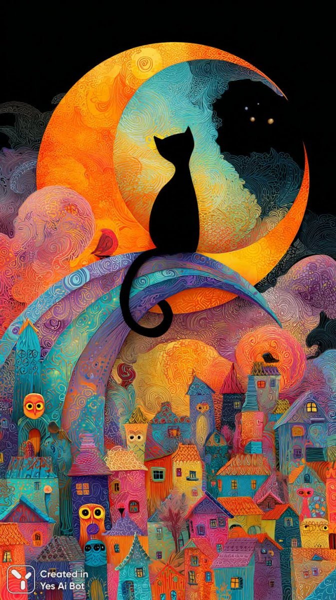 whimsical silhouette cat perched on a crescent moon, gazing down at a colorful village with radiant houses and playful owls, bright psychedelic surroundings with swirling colors and patterns, enchanting evening atmosphere, vivid details and soft enchanting lighting.