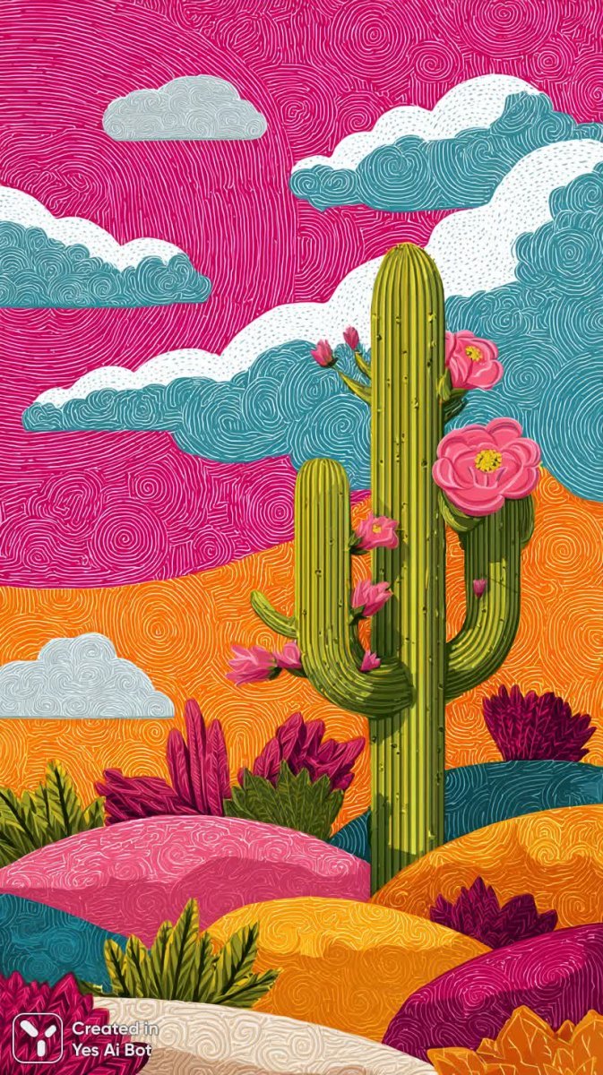Яркая и жизнерадостная пустыня, выполненная в мультяшном стиле, поражает воображение своим необычным великолепием. В центре композиции возвышается огромный кактус, усыпанный пышными цветами – символ процветания и красоты даже в самых суровых условиях. Задумчивый фон украшен причудливыми завитками и вихреобразными узорами, создающими атмосферу волшебства и сказки. В небе парит огромное сердце, наполненное любовью и позитивом, символизирующее доброту и гармонию. Насыщенные, яркие цвета, словно сорванные с радуги, придают картине особую энергию и жизнелюбие. Вдохновлённая наивным искусством, работа излучает искренность и простоту, приглашая зрителя в мир беззаботной радости и детской непосредственности. Весёлые узоры и повторяющиеся элементы создают ощущение праздника и наполняют пространство оптимизмом. Картина словно дышит счастьем и призывает ценить каждый момент жизни, находить красоту в мелочах и верить в чудеса. Это настоящее произведение искусства, которое дарит хорошее настроение и заряжает позитивной энергией. Яркие краски и игривые формы делают его идеальным украшением для детской комнаты или просто приятным напоминанием о солнечных днях и безграничной фантазии