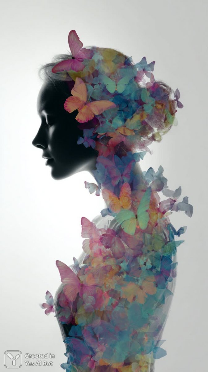 Нежная и умиротворяющая картина, где изящный женский профиль гармонично переплетается с волшебным потоком разноцветных бабочек. Их хрупкие крылья словно раскрываются вокруг нее, создавая впечатление единения с окружающим миром природы и фантазии. Мягкий, неземной свет проникает сквозь всю композицию, наполняя ее атмосферой сказочного сна, легкости и безмятежности. Яркие пастельные тона контрастно выделяются на фоне монохромного силуэта женщины, символизируя ощущение свободы, внутренней трансформации и преображения. Стиль фотографии высокого искусства с высокой детализацией передает сюрреалистичное настроение и яркую динамику происходящего. Элементы двойной экспозиции плавно сочетаются с естественной красотой, создавая эффект завораживающей иллюзии и визуальной гармонии. Это произведение искусства воплощает собой идею о хрупкости жизни, красоте природы и силе духа, способного к перерождению и полету в мир грез и фантазий. Вся картина излучает позитив и дарит ощущение внутреннего покоя и гармонии с миром