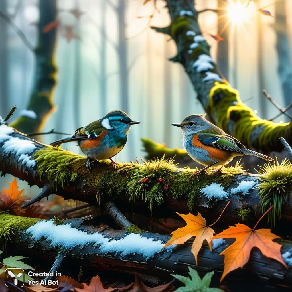 Волшебная акварельная пастель оживает на белоснежном холсте, создавая завораживающую двойную экспозицию. В центре внимания – восходящее солнце, сияющее сквозь густую зелень листвы, словно пробиваясь к жизни в сердце леса. Тонкая ветка клена, усыпанная росой, переливается под лучами солнца, а рядом на старой трухлявой коряге, поросшей мхом, примостились две маленькие лесные птички, уютно сидящие рядышком. Внизу раскинулась старая листва, покрытая инеем и мхом, создавая ощущение заснеженного леса. Нежные пыльно-голубые штрихи передают атмосферу свежести и прозрачности воздуха, а мягкий сфумато фон придает картине глубину и загадочность. Дальний вид леса уводит взгляд в бесконечность, создавая ощущение простора и свободы. Стиль картины напоминает работы Скетч Ли Богл и Виктора Милохова – легкие, воздушные мазки, акцент на текстуре и естественности цветов, передающие неповторимую красоту природы. Картина пронизана спокойствием и гармонией, приглашая зрителя окунуться в мир тихой лесной жизни и насладиться моментом умиротворения. Это не просто рисунок - это поэма, написанная красками и светом