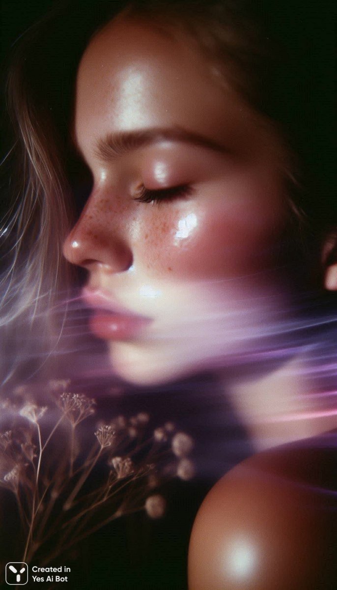 Завораживающая абстракция, сотканная из мгновений ускользающей красоты. Фотография на пленку с намеком на ушедшее время, где ночь растворяется в нечеткости, а вспышка запечатлевает мимолетный свет. Это живое фото, пульсирующее энергией и таящее в себе загадку. Прозрачные цветы сухоцветов словно парят в воздухе, отражая эфемерную красоту живой кожи с ее неповторимыми порами. Крупным планом представлен абстрактный портрет очаровательной девушки, чье лицо частично скрыто дымкой света. Длинные фиолетово-розовые и белые полосы, словно запечатленные в движении, создают эффект длинной выдержки или проносящегося источника света, окутывая образ таинственностью. Мы видим лишь часть лица – изящный нос, чувственные фиолетовые губы и нежную руку, прижатую к голове, а глаза полностью скрыты в мерцающем сиянии световых линий. Темный фон усиливает эффект неонового свечения, придавая изображению глубину и драматизм. Это больше, чем просто фотография – это поэзия света и тени, игра текстур и цветов, приглашение окунуться в мир сновидений и абстрактных образов, где красота ускользает, оставляя лишь отпечаток в памяти. Кажется, что время остановилось в этом капле мгновения, запечатлев мимолетную эмоцию и загадочную улыбку, навсегда скрытую под покровом света. Это гимн эфемерности и непостижимости женской красоты, воплощенный в нежной дымке пленки
