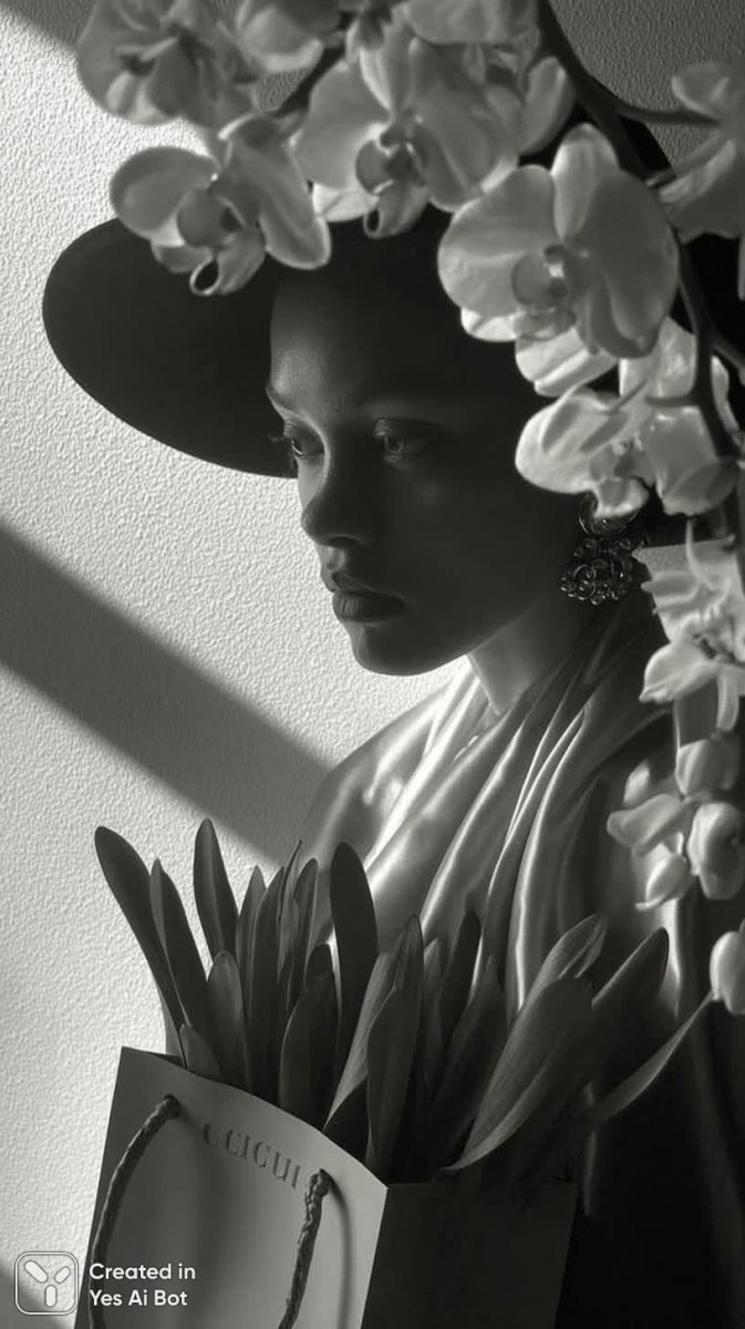 Теневая элегия: мода, цветы и ритм света в стиле Вог - Картинка, полученная с помощью нейросети Миджорни