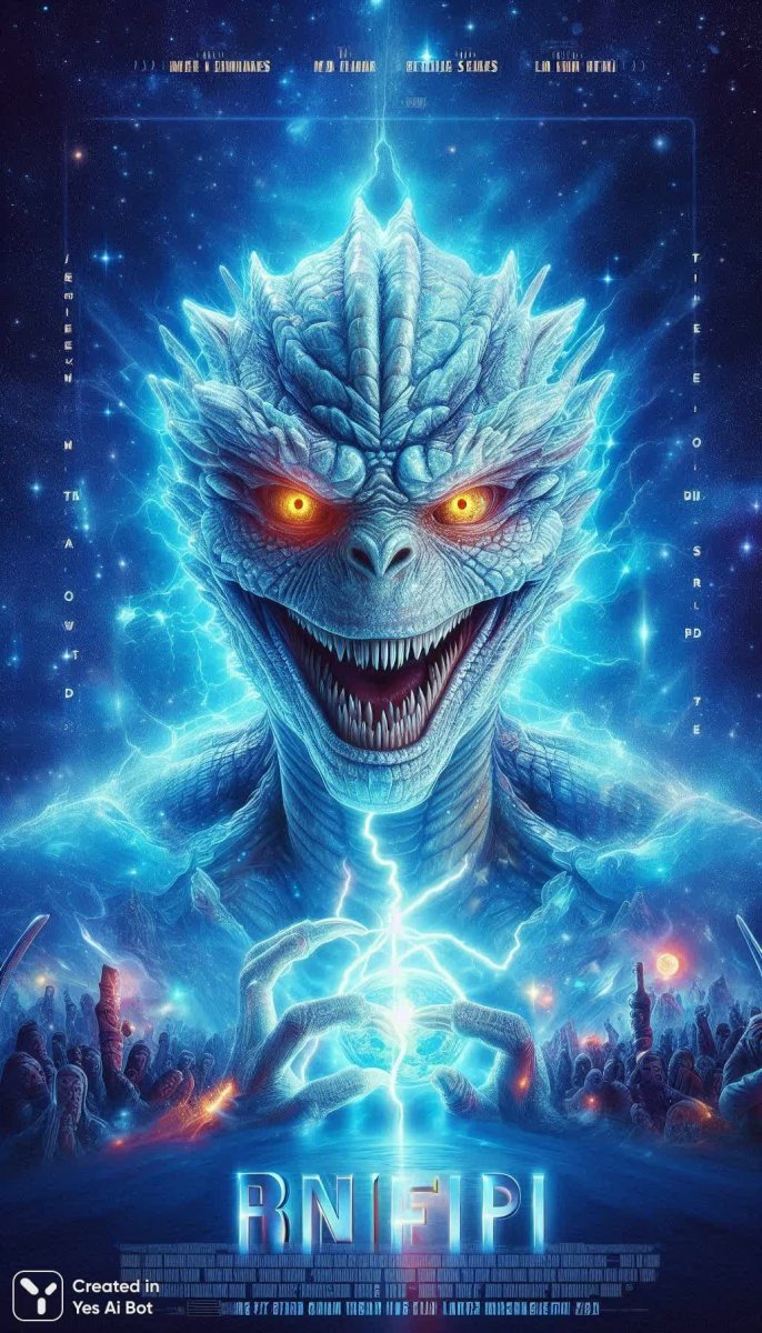 Poster for the film "Reptilian: The Great Universe", icy blue background with stars, a smiling face of a reptilian in the center, his hands glowing with electric power, a barely noticeable hint of the earthly world in the distance, the slogan "universal power" - the inscription at the top "universe: planet Earth", colorful computer graphics, CGI, 16k.