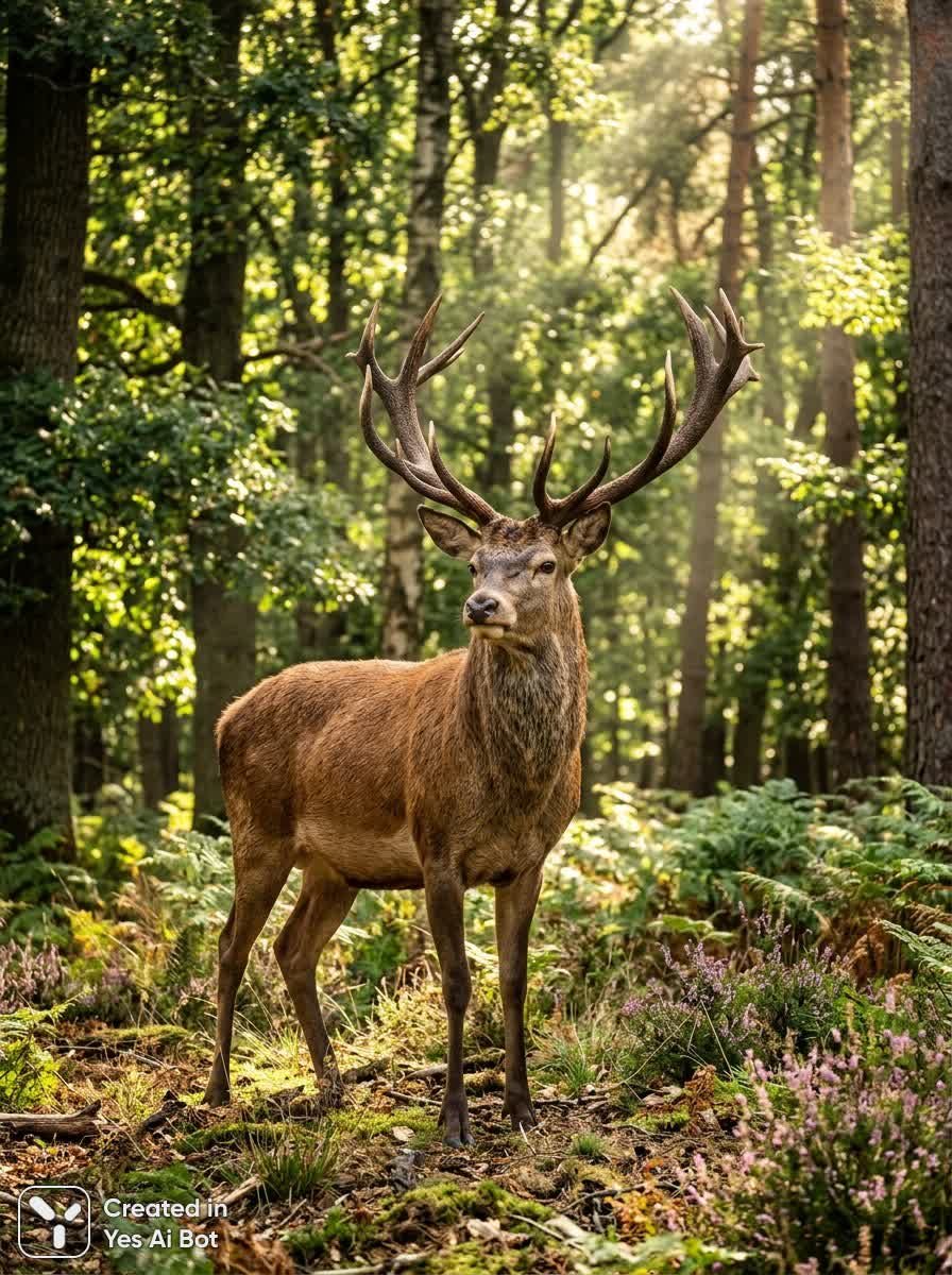 В самом сердце залитого солнцем лесного остекленения величественный благородный олень с мощными ветвистыми рогами гордо возвышается, воплощая собой символ дикой красоты и природной гармонии. Особь изображена в полный рост, уверенно глядя на зрителя, а голова слегка повернута влево, выражая бдительную осторожность и легкий интерес к окружающему миру. Его густая шерсть насыщенного красно-коричневого оттенка переходит в более светлые тона на груди и лапах, подчеркивая его благородство и силу. Фоном служит пышный зеленый лес с высокими деревьями, плотной листвой, папоротниками и яркими пятнами пурпурной вересковой травы. Мягкий солнечный свет пробивается сквозь кроны деревьев, создавая нежные блики и глубокие тени, наполняя пейзаж теплым естественным сиянием и добавляя глубину в композицию. Ракурс расположен на уровне глаз оленя, что позволяет зрителю полностью погрузиться в эту живописную среду обитания и почувствовать себя частью этой дикой природы. Реалистичный стиль изображения с тонкой детализацией мазков передает текстуру шерсти, листьев и коры деревьев, создавая ощущение реальности и вовлеченности. Картина излучает спокойную атмосферу безмятежности и гармонии с природой, приглашая зрителя насладиться красотой дикого ландшафта и ощутить величие этого благородного животного в его естественной среде обитания. Вся композиция представляет собой мастерское сочетание света, тени и цвета, создающее захватывающий образ оленя, символизирующего силу, свободу и непоколебимость природы