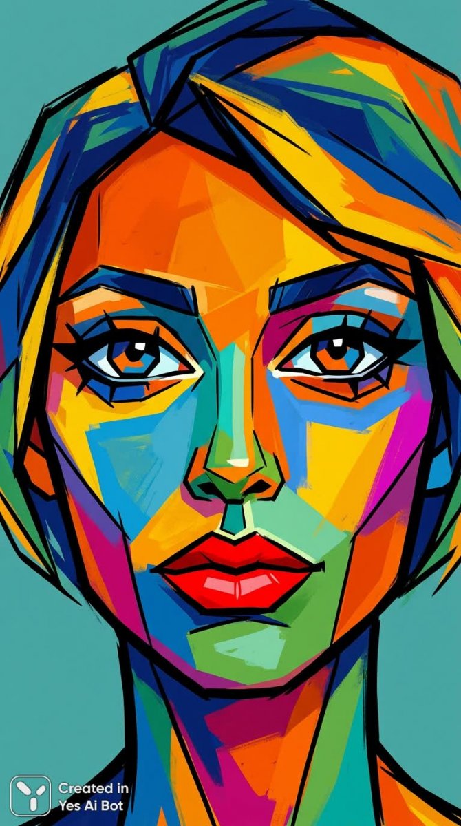 На изображении представлен портрет молодой женщины, созданный в цифровой живописи и отличающийся смелым сочетанием выразительности и геометричности. Акцент сделан на крупном плане лица, где заметны эмоциональные черты и яркие цветовые плоскости, формирующие эффект мозаики. Использование насыщенных, кричащих цветов придает работе ощущение энергии и жизненной силы, а четкие геометрические линии структурируют композицию, создавая современный минималистичный стиль.